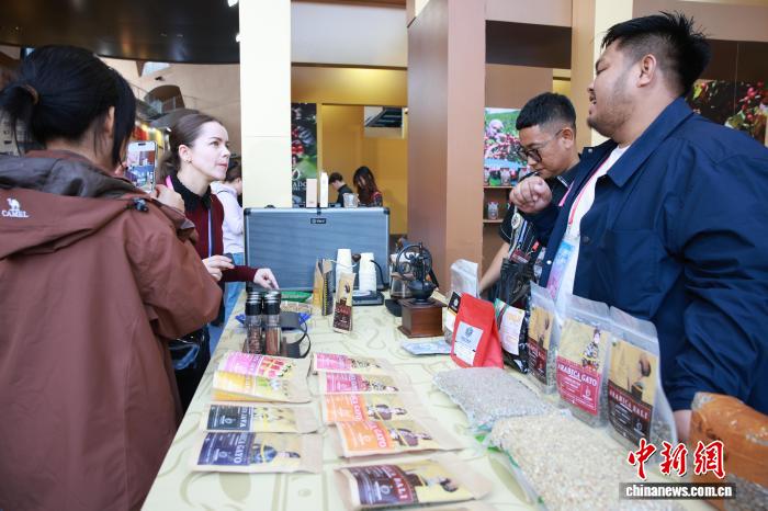 11月14日,外洋推销商推销咖啡豆。中新社记者 傅飞腾 摄