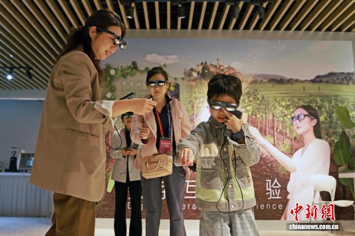 11月14日,搭客佩带AR眼镜,浏览外洋葡萄酒庄园风景。中新社记者 黄彦君 摄